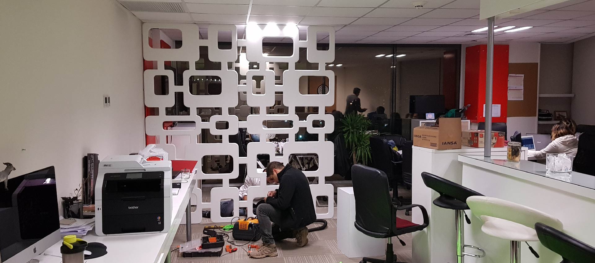 Una reconocida productora nos pidio la fabricación del logo de un separador de ambientes de oficina. Diseñamos una estructura bastante contemporánea y que encaje perfecto em el ambiente del espacio deseado.